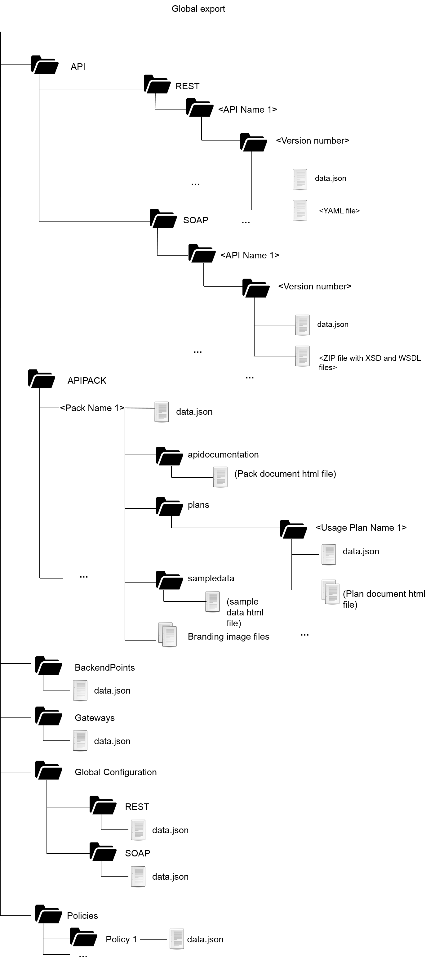 The exported Zip file is named 'export' and contains a master folder structured with sub-folders for each artifact type (e.g., API, API Pack, Policy, Backend). Each artifact instance resides within its respective parent folder, adhering to the specified list export format.