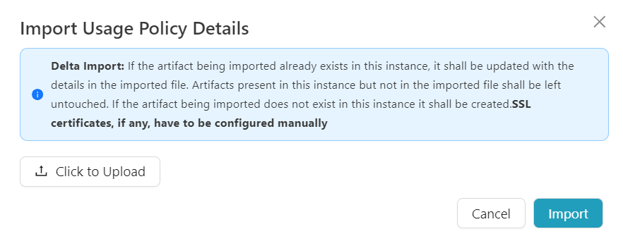 • Full Import - The existing artifacts will be removed from this deployment and the artifacts in the imported file shall be populated. SSL certificates, if any, must be manually configured.