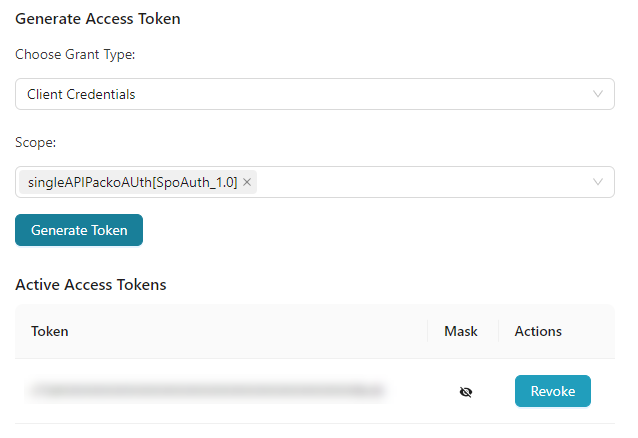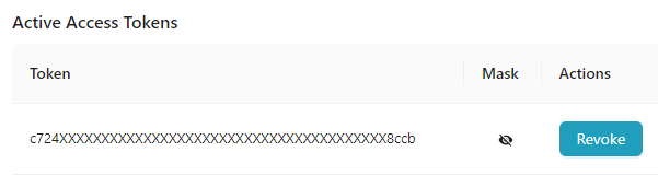 • The Active Access Tokens section displays the active access tokens. Active Access Tokens are masked by default.