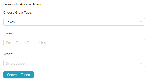 • The Generate Access Token section allows users to generate OAuth access tokens based on Grant Types.