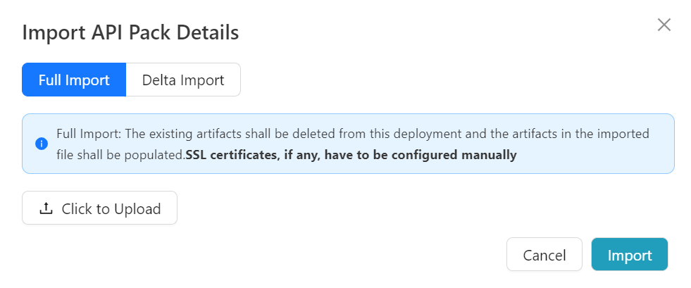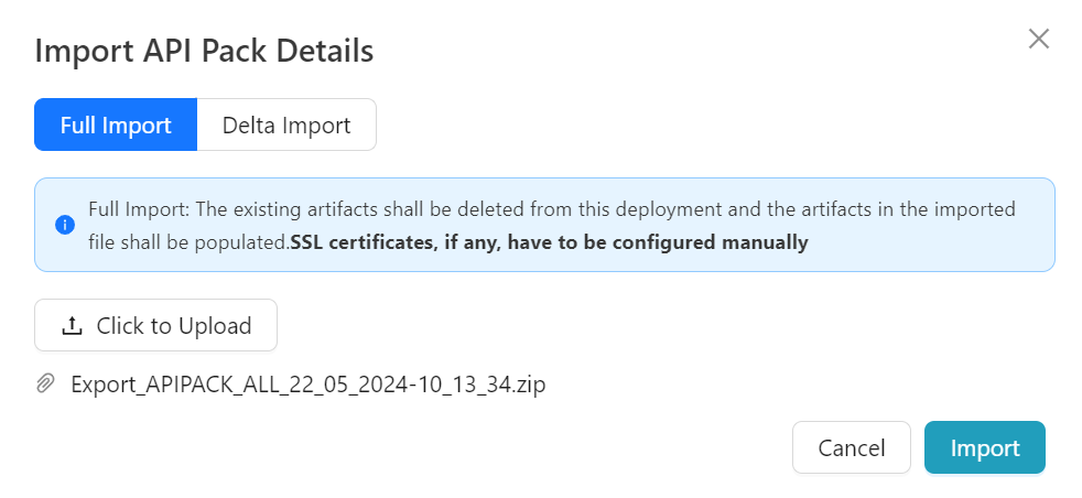 • Full Import - The existing artifacts will be removed from this deployment and the artifacts in the imported file shall be populated. SSL certificates, if any, must be manually configured.