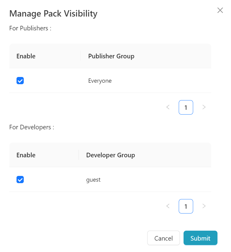 The API Pack's manage Visibility option lets you link Publisher and Developer groups to a Pack. Once a Developer Group is linked to a Pack, all of its members can access and subscribe to Plans inside that Pack.