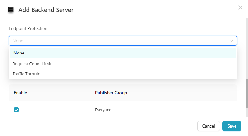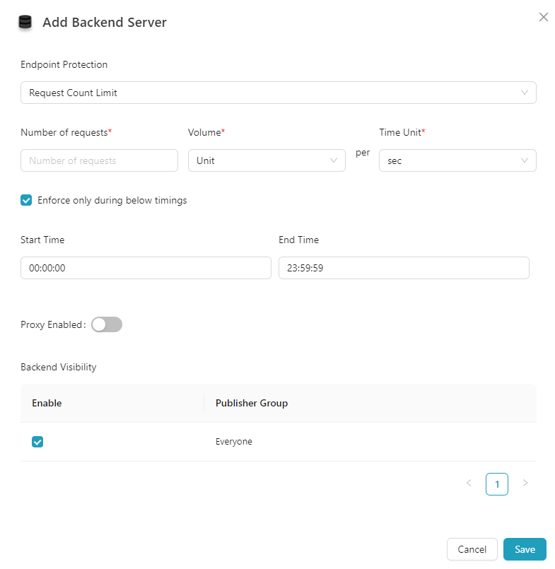 If Endpoint Protection is selected as either Request Count Limit or Traffic Throttle, the Number of requests, Volume, Time Unit and Enforce only during below timings (Start Time and End Time) fields are displayed.