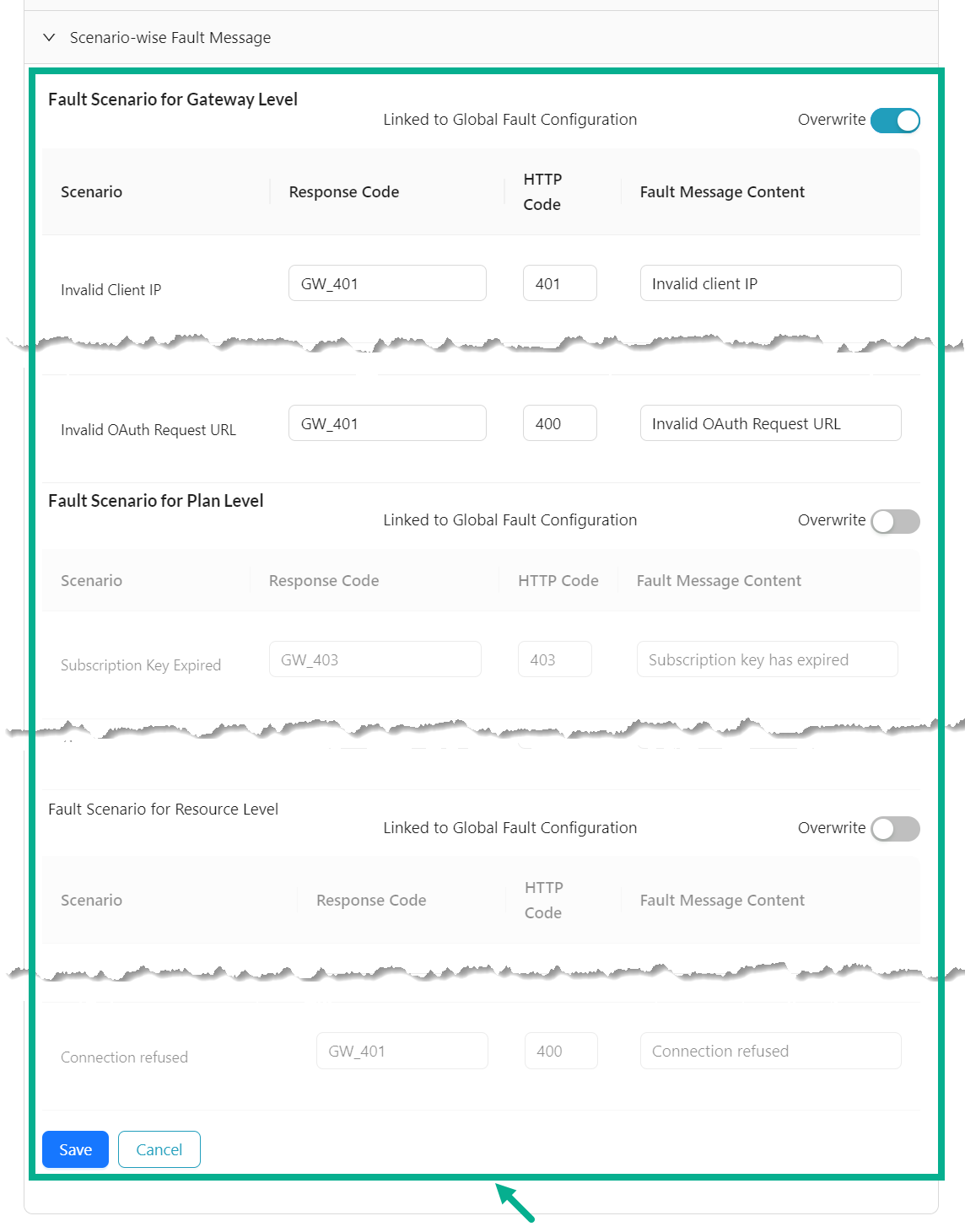 - Enable the Overwrite toggle to enable the Fault Scenario for Gateway Level, Fault Scenario for Plan Level and Fault Scenario for Resource Level if necessary.